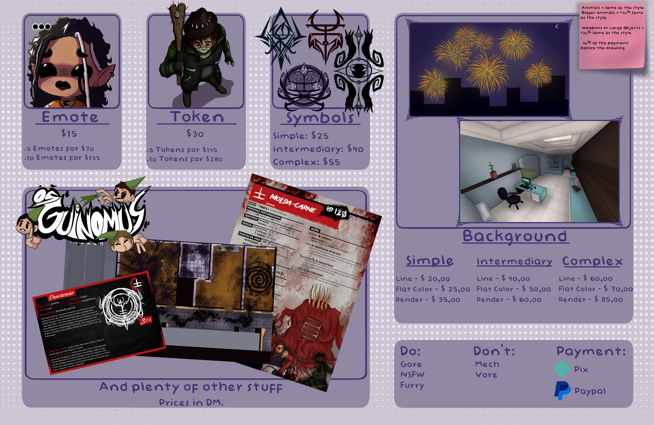 In addition, large weapons or big objects add 20% to the base price of the artwork.For payment, I accept Pix and PayPal only.